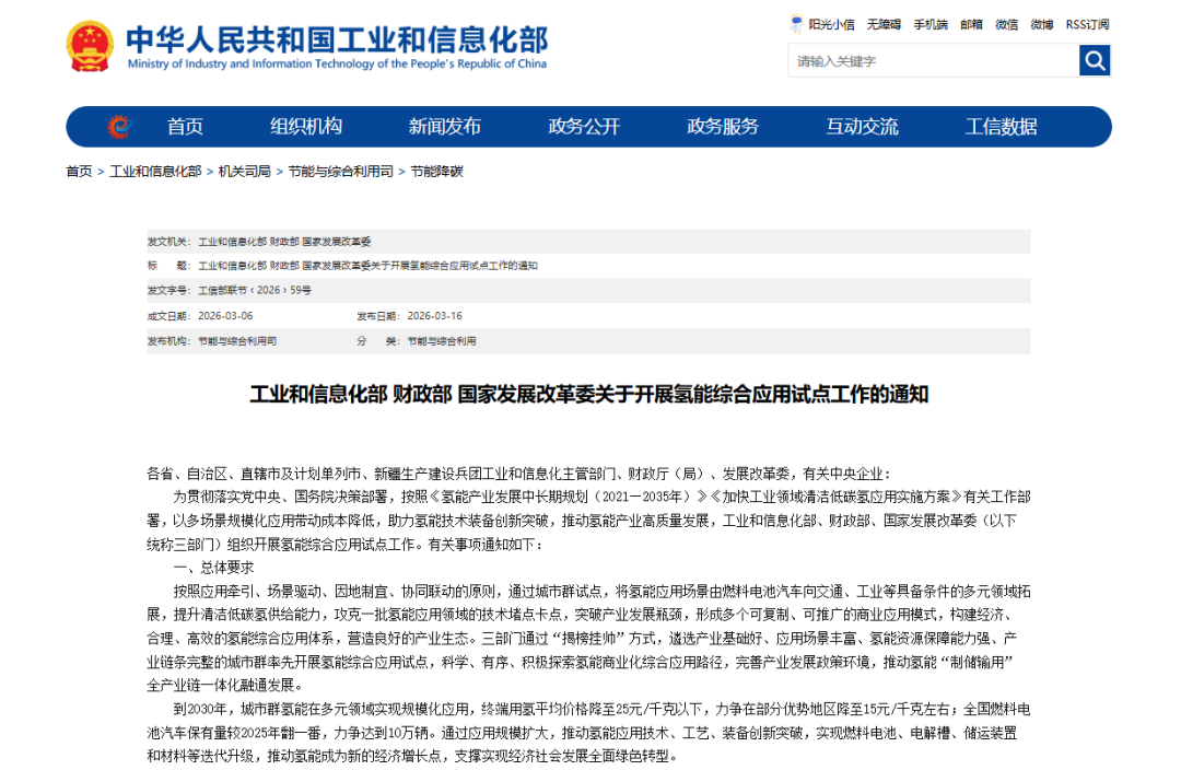 3月16日,工业和信息化部、财政部、国家发展改革委(以下统称三部门)发布《关于开展氢能综合应用试点工作的通知》(以下简称《通知》)。